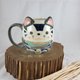 乖乖猫咪手工马克杯,猫咪猫色白色带黑灰纹路,戴着领巾,十分乖巧的坐着。手拉胚马克杯,手感厚实圆润,保温性佳容量400cc.