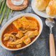 南洋叻沙咖喱鸡:去骨鸡腿肉、豆皮、秀珍菇、椰奶粉、味精、南洋咖喱酱(大豆油、咖喱粉、虾肉、糖、辣椒、柠檬草、花生、白胡椒粉) 。