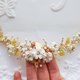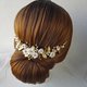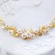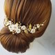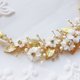 这款美丽的手工新娘发片由金色水晶,小金叶和白色玻璃珍珠制成。