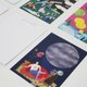 星球异想。明信片套组 商品介绍/ 五个不同星球想像 。Alone 。星星食验室 。泡泡星球 。星球快照亭 。草地观星