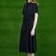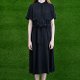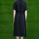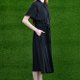 以黑色的轻柔纱质布料,营造出轻柔飘逸的都会简约风格,透过绑带产生柔美的皱褶,背部的大活折更有点缀的美感,是一件相当适合夏日穿着的典雅洋装。