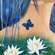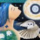 在月光下,人与万物牵起了手,徜徉在大自然无条件的爱中,彼此相互依存、滋养、成长、疗愈、修复、净化。纯净的水从女子头顶撒落,一路漫流而下注入池塘,成为睡莲的活泉。在满星夜空中,充满灵性的猫头鹰振翅而飞,像一位坚定的守护者环抱着女子,他们不须言语,而能彼此信任,沉浸在皎洁的月光中。