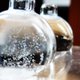 羽状结晶特写,玻璃瓶底下可以看到晶透的冰晶碎钻。