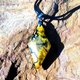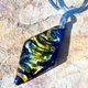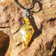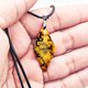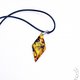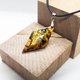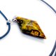 “The Golden Carbon”吊坠采用树脂与云母粉混合制成,尺寸为 4*2*0.7 厘米,搭配长度 50 厘米的黑色皮革项链,可调节长度。