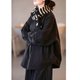 流畅的衬衫领,下翻几分帅气的直线式线条,显脖长。开门襟,除却领口小扣,一排古着气质的牛角扣。落肩长袖,大外套的标配,松量足够下,依旧有温暖的包裹感的,从外面看,袖口开衩一粒扣,结合更宽几分的袖克夫,几处叠褶下来,,看上去完全没有过多膨胀的胖感,反而略有茧型宽廓的小小立体感,而长袖也做的相对较长,更加强的包容性。前胸依旧是单边口袋的设计,轻盈减龄感。而两侧的口袋,没有做得很张扬,一字的视觉里,只有袋唇宽宽的,压着细腻的隐晦线迹,前面的细节已经够看,在后背依旧做了横向的分割线,左右贯穿的清爽,整体的个性越发得干净、洒脱起来。