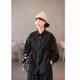 将棉与木棉混在一起,再织成高密的布料,完成成衣之后,进行染色,成衣染成一个旧旧的黑,颜色泛着陈旧而暖感的黑。