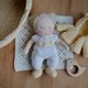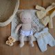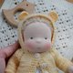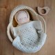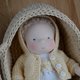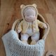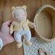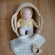 娃娃穿着棉质尿布、针织羊毛开襟外套、针织羊毛连身衣和钩针鞋。娃娃将附带一个钩针摇篮和针织毯子。