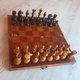 苏联制造的小型国际象棋模型。这套国际象棋制作于 20 世纪 50 年代末至 1960 年代初。木制骑士。国王和王后的顶饰也是用木头做的。漂亮的俄罗斯西洋棋套装复古。状况良好的复古棋子,无损坏。