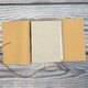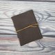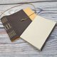 这本手作针织风格的极简主义笔记本,使用蜡线(浅橘色)缝制,封面配有魔鬼毡,可拆卸,封面材质为绒面革(复古棕色),并附有一条芥末黄色的小丝绒绳。