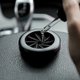▲ “都会黑”定番款(夹挂两用):涡轮造型水泥扩香、亮黑铝合金磁吸外框、质感黑意大利植鞣皮革饰圈 / 挂件。