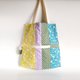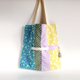 以色彩别致、宽度不一的长布条搭配制成的肩背托特包,尺寸理想,方便用于日常生活或用作购物袋。