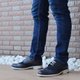 *深蓝亮面牛皮拼接深蓝反毛皮设计,穿出有型及个人特色