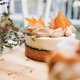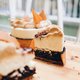 撒上可可粉挤上焦糖慕斯、最后在插上焦糖脆片。