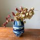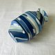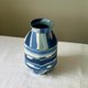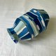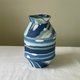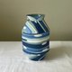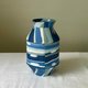 以不同的蓝色拼贴出条纹陶板后再以切割、绞胎堆叠等技法重组成瓮型的大花器。