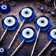 本作品以“守护之眼”为核心意象,将传统护符符号转化为透明糖体中的仪式标本。层层蓝环如同被封存的视线,在静止的时间中持续凝视,仿佛实验室台面上一件被研究、被信仰、也被畏惧的物件。整体风格融合神秘学、理性秩序与禁忌美学,呈现一种介于甜美与警示之间的收藏张力。