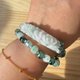 这款手链的主体是雕有盛开牡丹的半镯,玉石呈现柔和的白绿渐变和精致纹理。