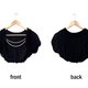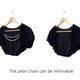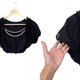 ▲ 短版罩衫,为短袖露脐上衣,网纱材质,荷叶边设计,气球袖,正面缀有串珠流苏装饰(流苏可拆卸)。
