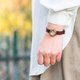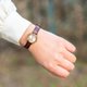 OLIE的父亲以樱花的颜色为灵感采用独创的木版染色制作出带有木头纹路的酒红色表带。