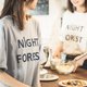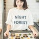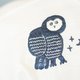 T恤正面绣着NIGHT FOREST。夜晚的森林,是充满着想像和神秘的,许多动物此刻才开始活动,像是飞鼠、野兔、和草鸮,都是属于夜行性的物种。而这次的主角是新登场的草鸮,搭配的绣花线选择暗夜的蓝和月光的银白来表现。而英文字Night Forest 其中字母i 上的圆点,既是小写、也是圆月。