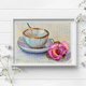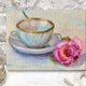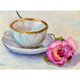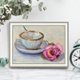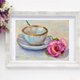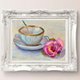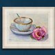 茶杯和玫瑰的静物画取材于生活,并以浅淡柔和的色彩呈现。