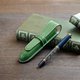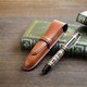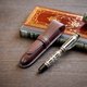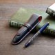 这款单支钢笔套,采用意大利皮革,以独特的木制模具,将前后两片皮革一体成型地绞制而成。
