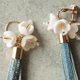 Denim tassels are swaying under flowers created with polymer clay.