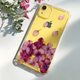 【1】手机壳是全透明包四边的软壳,手机壳表面会灌一层宝石胶把花材封起来,花材最终会相嵌在中央,所以不用担心会掉落问题。有些花朵比较厚或有重叠之处,有可能轻微凸起摸得到(例如:雏菊蕊/飞燕花蕊/满天星)