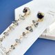 以白色与黑紫色满天星为素材,上方串接几何切割的珠饰。