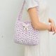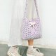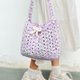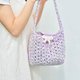 ꕤ 这款手袋由白色和紫色毛线细致钩织而成,