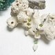 贝壳做成的叶子,搭配如云朵般的巴洛克珍珠碎片与青蕨黄水晶,再用柠檬黄、嫩果绿点缀出亮度