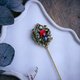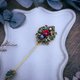 今天的套组两侧的结构以如缎带般柔软的线条,呈现有如揭开幕帘,且以不同颜色的人造宝石,堆叠出正反两色的立体感。耳环上缘似乎藏着一支十字架,下方的三色小宝石排列如皇冠,而帽针则以与耳环上下相反的方向,呈现更为丰富的变化。红白蓝三色搭配出欧洲皇室的质感,在日常配戴间闪烁着刚刚好的奢华与典雅并存。