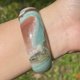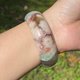 底色为灰冰果冻底,透光好、边缘能起萤光。主要的彩虹色系包含草绿与薄荷绿、西瓜红与粉嫩红,渐层分布整圈手镯,不管转到哪一面都很精彩。在玛瑙花的底色处则是焦糖色,其中的玛瑙花洁白干净,有花瓣、花心,呈现明显花形。