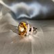 优雅美丽的鸡尾酒戒指,采用来自缅甸的肉眼可见的饱和火金黄色明亮椭圆形切割黄水晶。 20 年前,我们购买了这颗宝石,并与台湾台北的家庭金属匠一起制作了这枚戒指。其活泼的光芒和独特的设计值得添加到您的收藏中,并且可以轻松搭配您的休闲牛仔布派对服装。