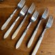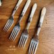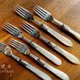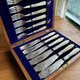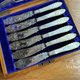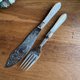 大约1870年代物件,镀银 EPNS,带有细致手工雕刻装饰, 立体螺旋麻花珍珠母贝手柄, 其中二支叉具有不同风格的雕刻图案,但设计和尺寸都相同,无明显磨损,一支刀手柄尖端背面有小缺口所以不太明显,原装橡木盒配有黄铜配件,非常美丽且完整的古董餐具 值得收藏!