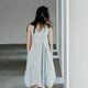 Flax-blossom seas In wind In mind From us To you To be affined With the cityscape in the background there walks a woman, confident and free from constraint - contemplating feelings that her linen dress suggests. The fabric that touches her body tells her about those days when a man and nature worked hand in hand. It comforts her passing by chaotic, homogeneous everyday scenes. This is the story of us. We seek to create sartorial elegance in simplicity and humble yet sincere return to innate values of human culture. Linen is our tool. Poetry is our language.