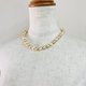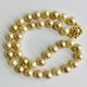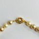 这是一条日本制的玻璃珍珠项链,采用原始玻璃材质,涂上多层原色珍珠漆。采用全打结工艺,在每颗珍珠之间小心地打一个结。珍珠色采用多颗金基珍珠,其特征是质地细腻,光泽柔和,随机使用。珍珠尺寸是一个相当大的球,直径约10毫米,长度是标准公主尺寸约44厘米。对于扣环,我使用了带有一颗树脂珍珠的插入式扣环。