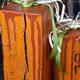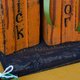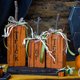 - 秋季家居装饰. 由回收的天然木材制成的环保装饰. 一组三个橙色南瓜,标题为 “trick or treat”