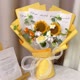 这束花束的核心是一朵令人惊叹的向日葵,它是幸福和正面的象征,就像我们生活中的指引灯。伴随着它的是丰满的毛球,充满了趣味和欢乐,还有柔软的棉花花朵,为人们带来温柔的触感和舒适感。再加上一朵惊艳的黄色玫瑰,象征着爱与美的壮丽,增添了一丝浪漫气息。