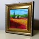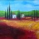 这幅油画作品描绘了法国翁佛乐小镇的郊外风光。高耸的柏树与白色小屋相映成趣,红色土地与绿草相融,展现出浓烈而和谐的色彩层次。深秋季节的郊外的田园景色。