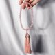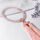 遵循日本传统**日本念珠(数珠 じゅず)**端正而庄雅的造型语汇,严选天然**粉晶(芙蓉晶,人缘、贵人、桃花)**搭配珊瑚粉色绢制流苏,细致展现**台湾工艺美学 × 日本礼仪文化**的和谐融合,并承载**台日友好**的深厚底蕴。