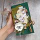 杂志采用优质材料制成,包括优质卡片纸、手工老化纸和迷人的装饰。它采用坚固的精装本,饰有令人惊叹的森林主题设计和配套的丝带会封口。