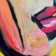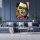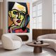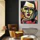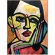 这幅画作是一幅充满活力的抽象肖像,其特征是大胆、碎片化的形状和鲜艳的色彩。脸部由黄色、绿色、蓝色和红色的几何图形构成,呈现出一种动态的立体感。粗黑轮廓的运用使人物五官更加清晰,与色彩斑斓的背景形成了鲜明的对比。