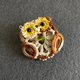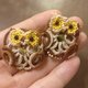 这个猫头鹰胸针是设计师的原创设计,用缎染的棉线以梭编的技法编成。