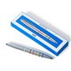 扭动这支笔的笔杆以显示或隐藏彩虹色的圆点。在实心黄铜芯上由抛光铬制成。使用派克的圆珠笔笔芯。