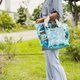 包包一半采用压皱处理的 Tyvek,并缝合了色彩鲜艳的内衬;另一半则使用 PVC 透明软片,打造出充满夏日气息的个性托特包。