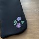 Taking inspiration from flowers I saw in a park in Taiwan after the rain, I embroidered two flowers with a purple gradient color from pink to blue like a hydrangea. The raindrops left on the leaves were expressed with beads. It is a design of a very gentle atmosphere.