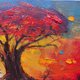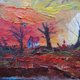 红色五颜六色的日落和巨大的橡树在晚上一些房子油画厚涂