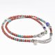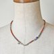 这条项链由蓝人字形、彩色银、绿松石蓝人字形和琥珀白心形制成。