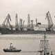 在背景中,起重机和其他港口机械形成了垂直线条的节奏,与水平的水域形成对比。阴影和交叉影线的微妙纹理丰富了影像,增加了深度和氛围感。