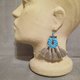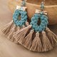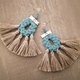 Boho tassel earrings made with braided turquoise t-shirt yarn and natural linen tassels. Silver tone ends, jump rings and fish hook ear wires with clear silicone back stoppers. Adorned with blue glass crystals and beads.